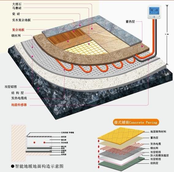 電地暖的發(fā)熱體主要是發(fā)熱電纜。發(fā)熱電纜的工作原理是將特制的發(fā)熱電纜敷設(shè)于房間地面構(gòu)造層內(nèi),當(dāng)發(fā)熱電纜通電后,其工作溫度是40-60℃條件下,將電力能源轉(zhuǎn)化為熱能,通過地面作為輻射散熱面,把熱量主要以輻射傳遞至房間而達(dá)到供暖目的供暖方式,發(fā)熱電纜供暖系統(tǒng)中,電能轉(zhuǎn)換為熱能熱效率可達(dá)99%以上,其中輻射換熱量約占總換熱量60%以上。